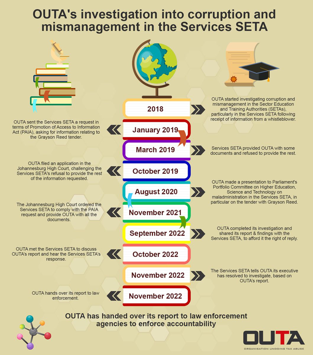 - On 25 August 2020, OUTA made a presentation to Parliament's Portfolio Committee on Higher Education, Science and Technology on maladministration in the Services SETA, in particular on the contract with Grayson Reed.
